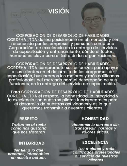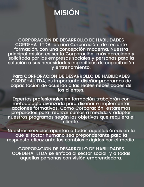 Nuestra principal misión es ser la Corporación más apreciada y solicitada por las empresas sociales y personas para la solución a sus necesidades específicas de capacitación y entrenamiento.